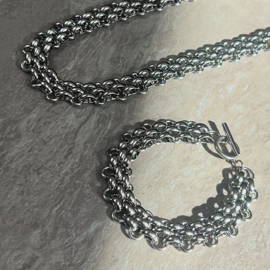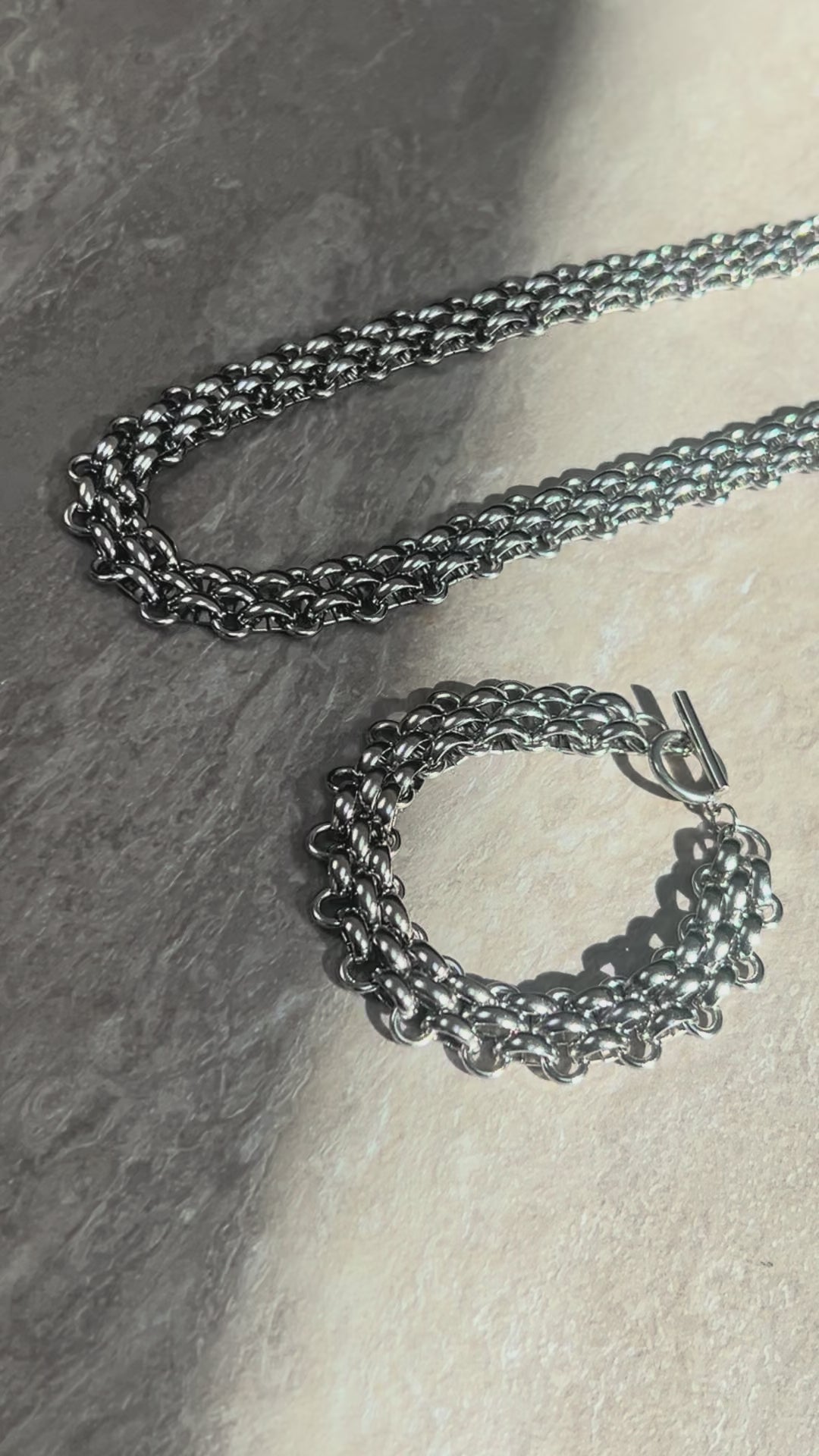 A chunky plaited t-bar style bracelet, designed to make an impact. Pair with the matching necklace to compliment your look!
