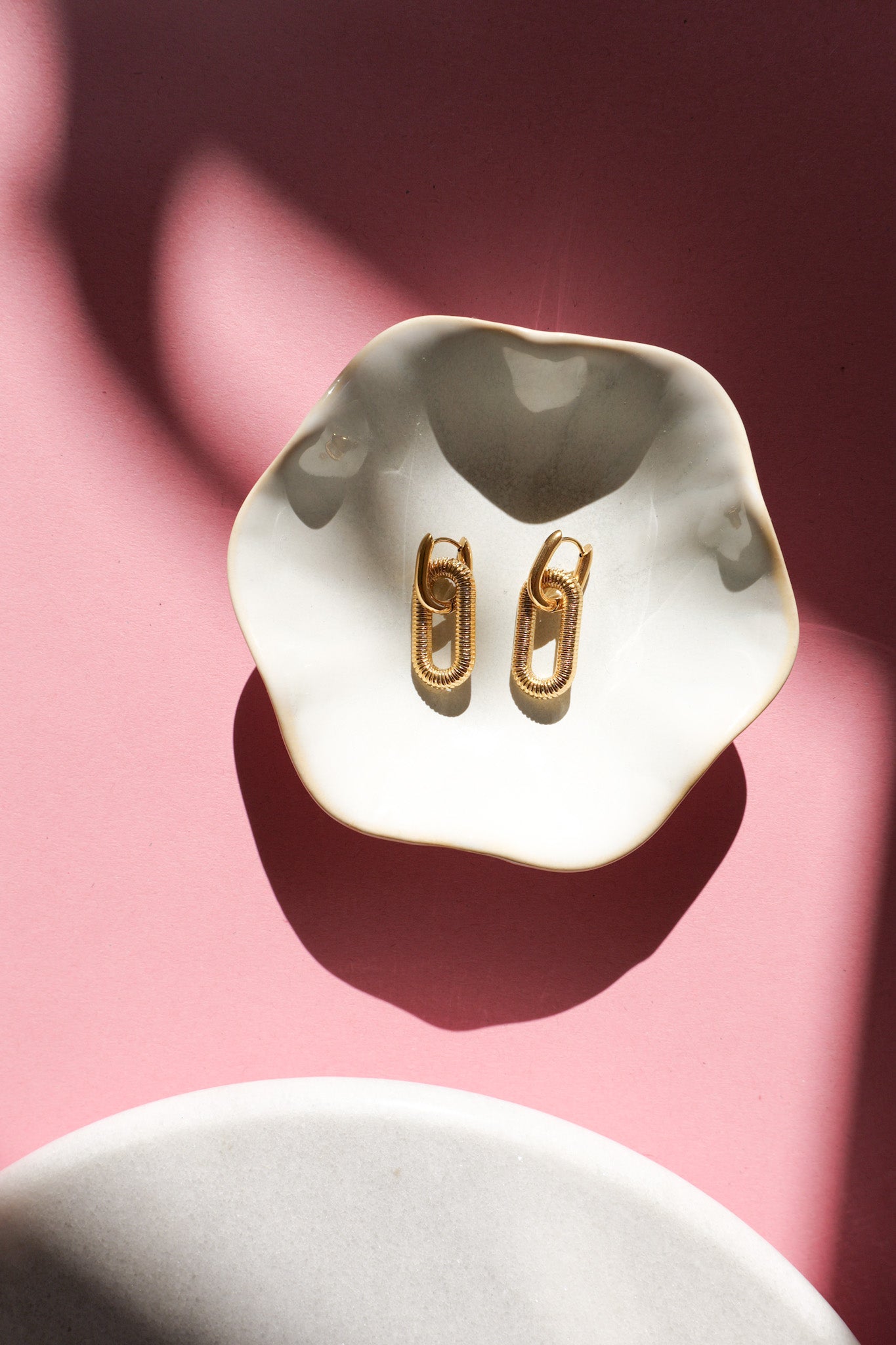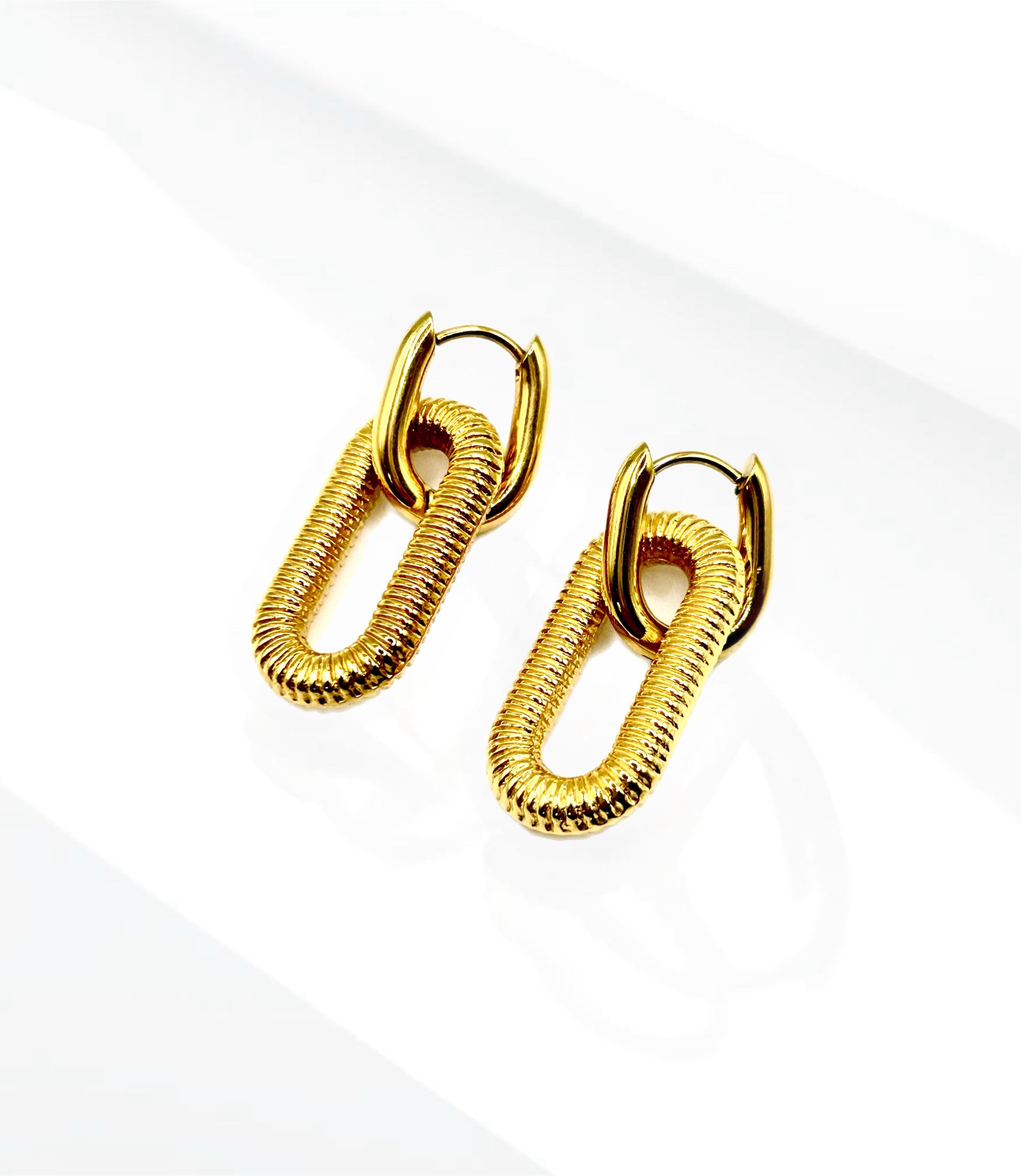 Dual drop earrings, with ridge oval drop and polished hoop.